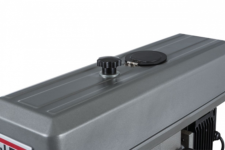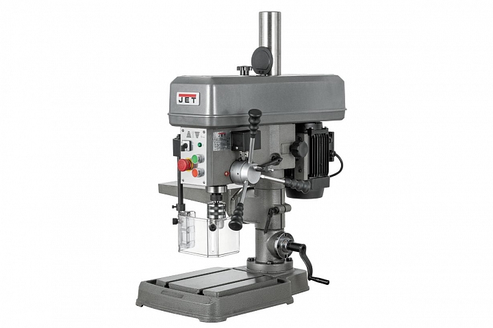 Станок сверлильный настольный IDTP-16 возглавил новую линейку станков JET с возможностью нарезать резьбу. Данный станок производится в Китае, что позволяет снизить стоимость изготовления, а это непосредственно влияет на цену станка в России. Станок оснащен мощным двигателем 500Вт и способен в режиме долгих нагрузок нарезать резьбу до М12. На станке установлен асинхронный двигатель, на который установлен шкив с 5-я ручьями, перекидывая ремень по ручьям шкива, вы меняете скорость от 200 до 2350 оборотов в минуту. Данное решение в тандеме с легкой натяжкой двигателя и надежной фиксацией, позволяет сохранить и передать хороший момент на шпинделе. Основание станка отлито из серого чугуна, станок устанавливается на верстак или стол, подстолье и фиксируется болтами. Надежная фиксация позволяет уменьшить вибрации. В основание вставляется толстостенная труба, на которую непосредственно крепится голова сверлильного станка. В управление станок достаточно прост.