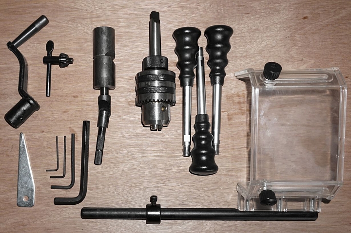 Все управление расположено на лицевой части станка, есть два режима, резьбонарезание и сверление. В режиме сверления станок применяется как классический сверлильный станок отверстия до 16 мм. В режиме нарезания резьбы, станок автоматически меняет направление вращения шпинделя при достижении заданной глубины. Глубину задает оператор, выставляется она с помощью поворота нониуса со шкалой до нужной глубины. После достижения нужной глубины нониус фиксируется и при достижении заданной глубины срабатывает конечник и включает обратное вращение шпинделя. Это решение известное и проверено не одним десятком лет и позволяет в режиме высоких нагрузок нарезать резьбу в заготовках. Заготовка устанавливается на стол, выполнен он так же из серого чугуна, стол имеет возможность поворота и регулировки по высоте. Станок поставляется с патроном и дорном на конус шпинделя МК-2. Отличный станок по отличной цене и не забывайте про условия нашей гарантии.